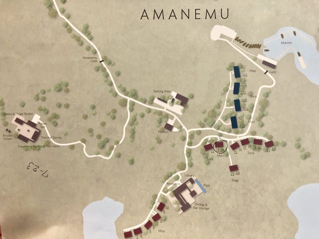 こちらはアマネム内の地図です。左端にあるのがSPA棟、中央にロビーがあるパビリオン、中央下はダイニングとプールがある施設があります。